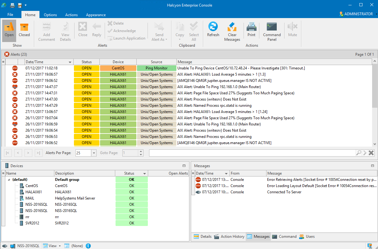 Alert details, device identities, device details, action histories and associated alert messages are displayed, by default, in panels contained within the main Enterprise Console window.