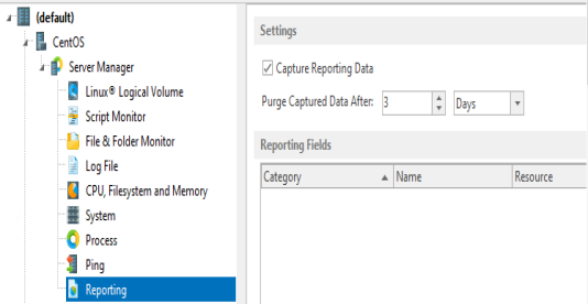 Once these settings have been specified, specific field data can be added to the Linux Reporting monitor.