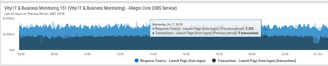 The image above shows the Response Time and Transaction information for the last 24 hours in the Allegro Core (OBS Service). With Compare to Previous Period activated, moving the mouse pointer over the chart, shows a pop-up window containing information for both metrics over the previous period are visible.