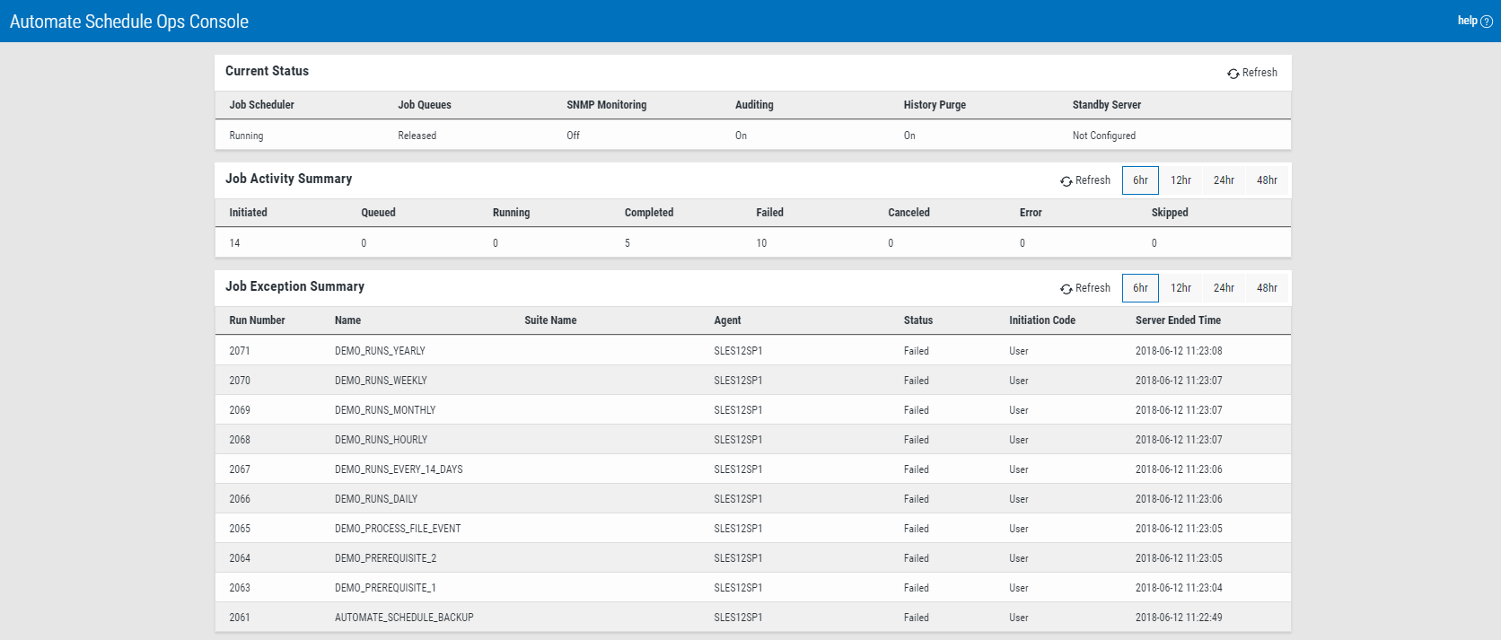 - Job Exception Summary: Displays a list and information of Failed, Canceled, and Error jobs. A time filter of 6, 12, 24, and 48 hours is available for filtering.