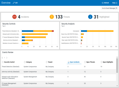 The information provided on the Overview display is a summary of the current security events and workload of the security analyst team.