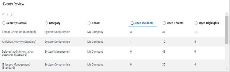 The Events Review panel displays an analytical breakdown of the Security Control graph by providing textual information relating to each of the security controls.