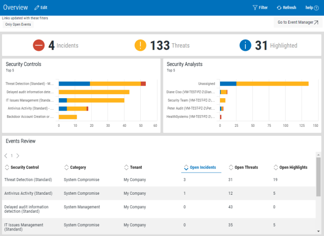 In the Overview header bar, a summary of all the open incidents, threats and highlighted events is shown. This gives a quick, at-a-glance view of the workload faced by the security analytical teams.
