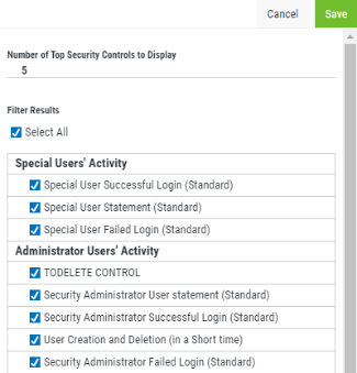 By default, the Top 5 security controls or security analysts are displayed in these panels. This can be changed by clicking the