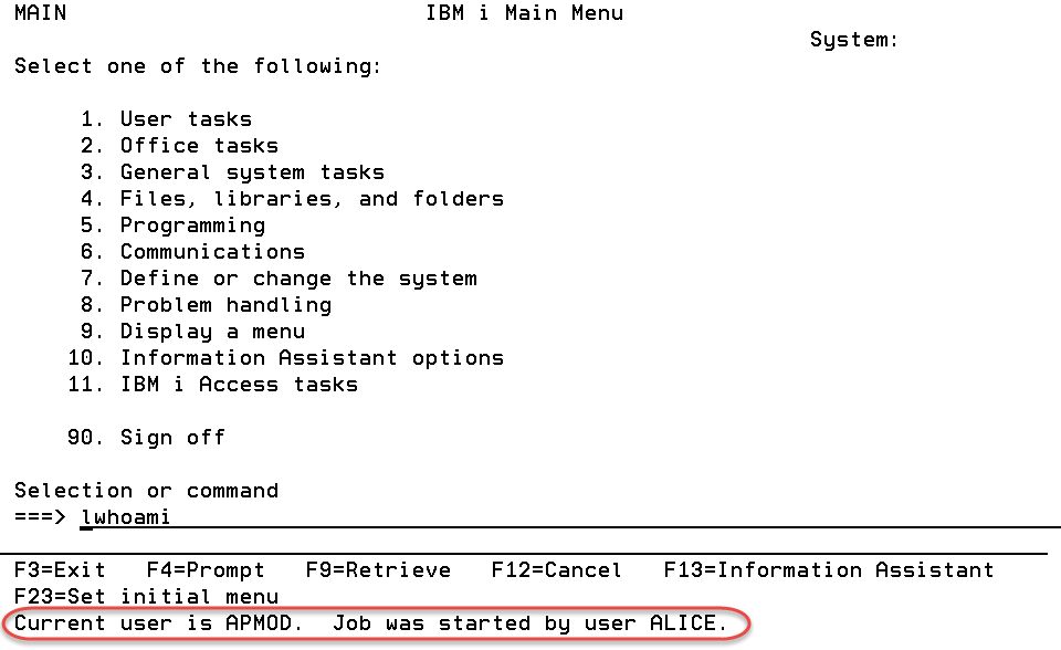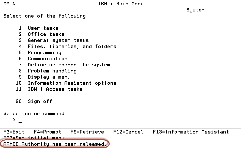 It is important to note that IBM menus are determined at the beginning of the job, and are not changed once the user assumes new authority. So for example, if switching from a 'high' authority to a 'low' authority, the IBM menu will retain the 'high' authorities menu options. (For a detailed discussion on object authority and how it works see the IBM i Security Reference manual.)