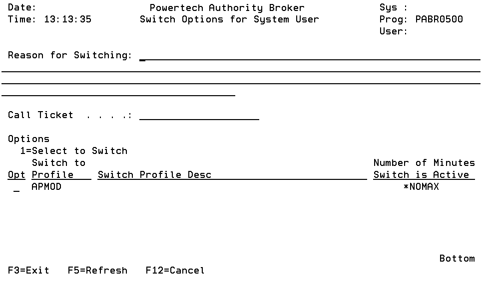 - When the LSWPPRF command is run, in an interactive environment, you will normally be prompted to provide input. In a batch environment, the batch program has to provide the switch profile and any other info, such as the ticket #, as command argument.