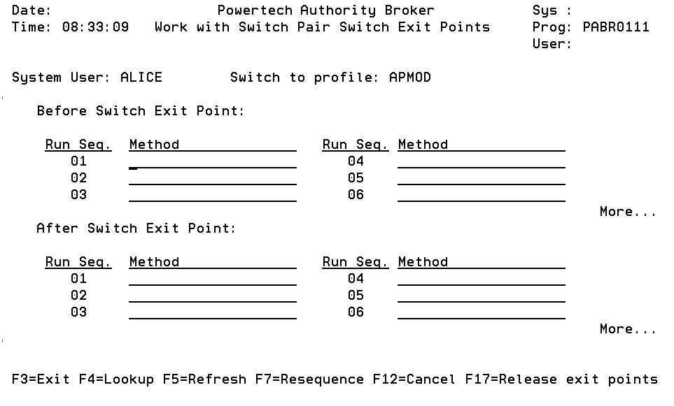 F7 (Resequence): Exit Points Displays the screen used to re-sequence exit point methods.