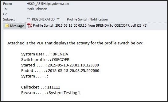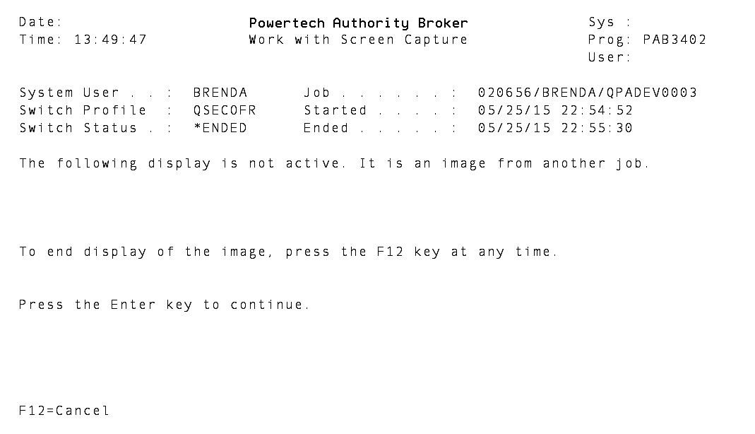 Screen Captures taken during Profile Switches can be viewed and distributed to Interested Parties from the Work with Profile Switches screen. You can view individual screen capture images of profile switches, or select any number of captured sessions to be sent to one or more Interested Parties.