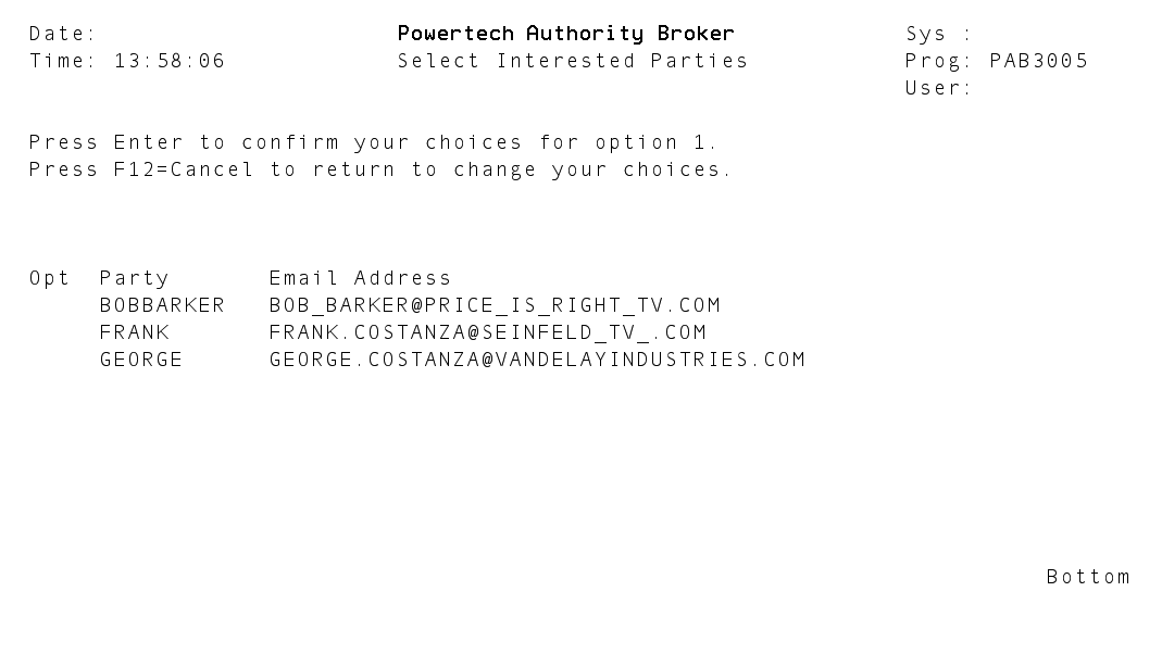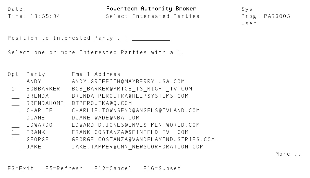 - Press Enter. A confirmation screen appears that includes a list of the selected Interested Parties.