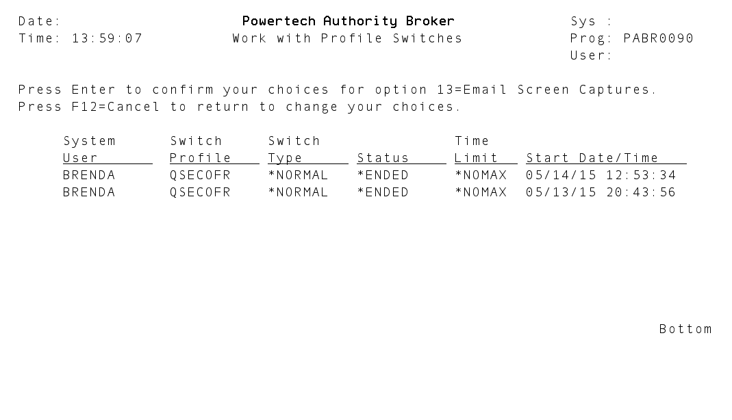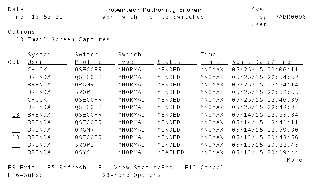 - On the Work with Profile Switches screen, enter option 13, Email Screen Captures, for one or more Profile Switches.