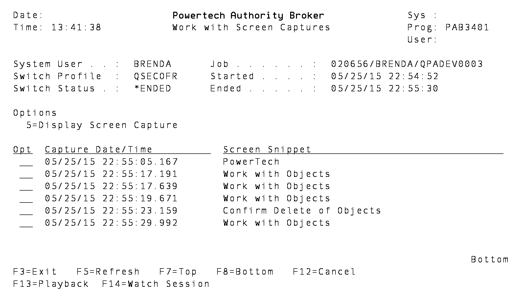 - Enter 10 for a Profile Switch. The Work with Screen Captures screen appears.
