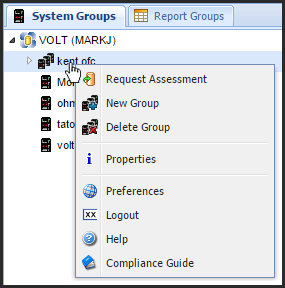 - Request Assessment: Displays the Request Assessment window from which you can select the reports for an Assessment. Requesting an Assessment from a system group runs the Assessment on all Endpoints in the group.