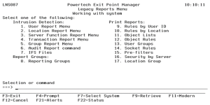 To display the Reports Menu, select option 4 on the Powertech Exit Point Manager for IBM i Main Menu. Press F11 to switch between the Modern and Legacy Report Menus.