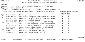 The Work with Security by Server/Function panel displays a list of functions for a specific server and allows you to go to the Edit Location Authority, Edit User Authority, and Server Function Properties panels. You can also access a display of Captured Transactions and Memorized Transactions subset by Server/Function, if any exist.