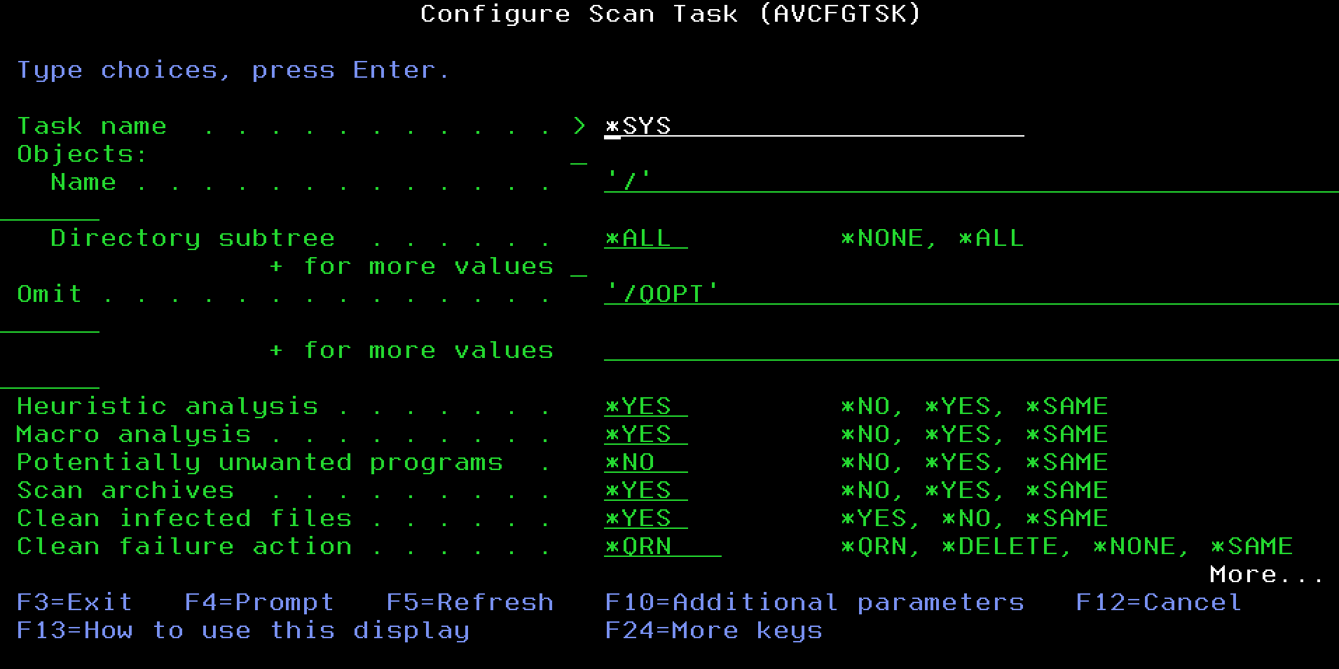 The following command configures the system task to scan the entire IFS for viruses, clean infected files, quarantine files that cannot be cleaned, and excludes scanning of the CD-ROM drive. The task will start every Saturday at 1am:AVCFGTSK TASK(*SYS) OBJ(('/' *ALL)) OMIT('/QOPT') CLEAN(*YES) CLEANFAIL(*QRN) RUNPTY(99) SCHEDULE (*WEEKLY) SCHEDDAY(*SAT) SCHEDTIME(010000) - Review the additional job parameters and make adjustments as necessary, then press Enter to submit the scan job.