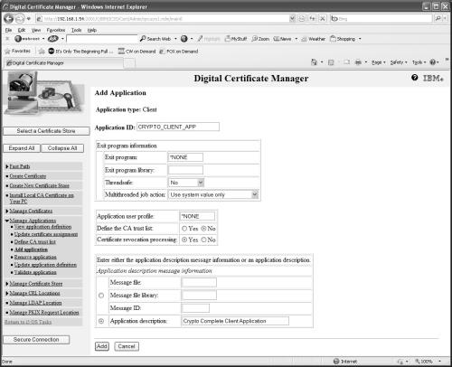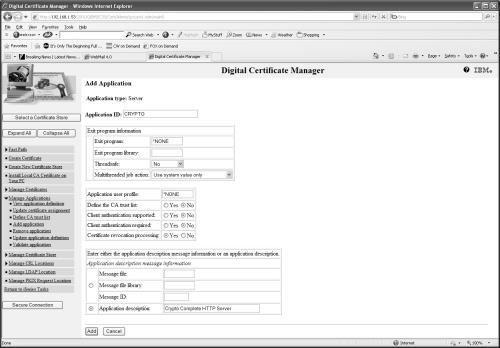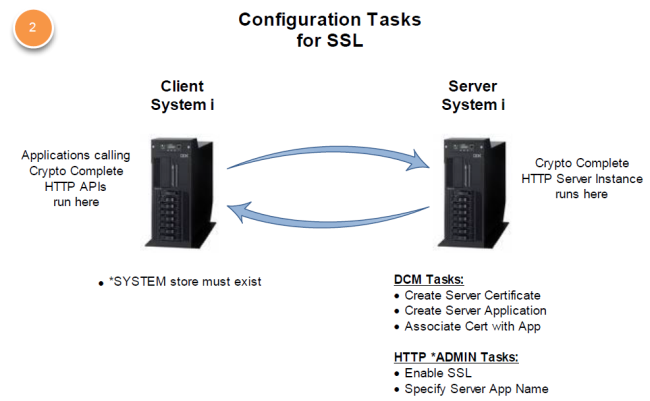 - If configuration option 2 will be used, then the configuration tasks are complete. You are now ready to use the Crypto Complete HTTP APIs from the client System i. Do not specify an application ID when using the APIs with a Basic SSL configuration.