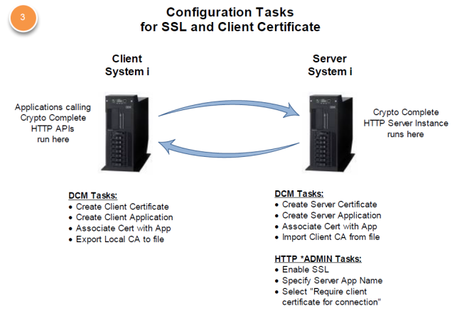 There are configuration tasks that will need to be done on both IBM i systems in order for Secure HTTP to be enabled between Powertech Encryption for IBM i HTTP APIs on one IBM i (client) to the Powertech Encryption for IBM i HTTP Server instance on a second IBM i (server). Discussing two IBM i systems as client and server can be confusing. The following diagrams will help to clarify the tasks to be performed when configuring SSL for use with Powertech Encryption for IBM i.