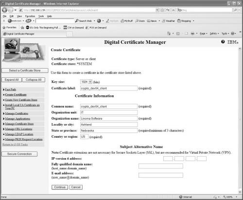 - Enter a label for the client certificate. We have used ‘crypto_dev54_client’ because it is descriptive. Enter values appropriate for your organization, then click Continue.