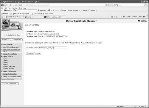 - Enter an IFS path and filename for the exported certificate, then click Continue. In our example, we use ‘/home/dev53_local_ca’.