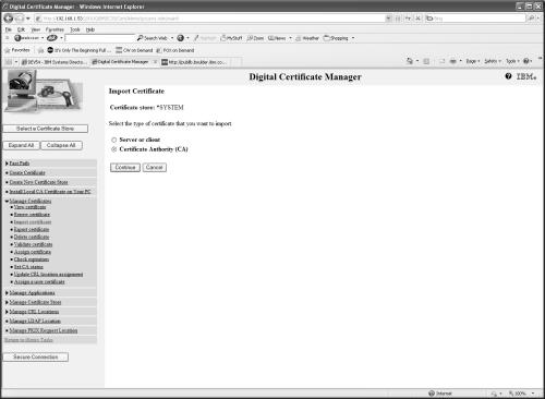 - Click on the Import Certificate link at the left side of the screen. Select the Certificate Authority (CA) radio button, then click Continue.
