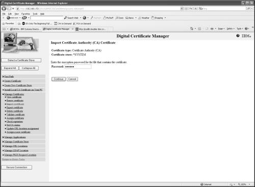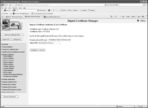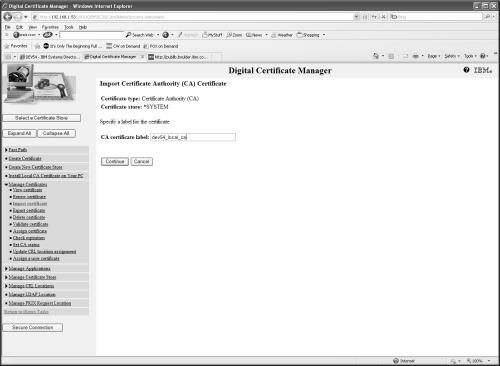 - Enter the IFS path and filename of the certificate to import that you FTP’d from the client System i, then click Continue. In our example, we use ‘/home/dev53_local_ca’ again.